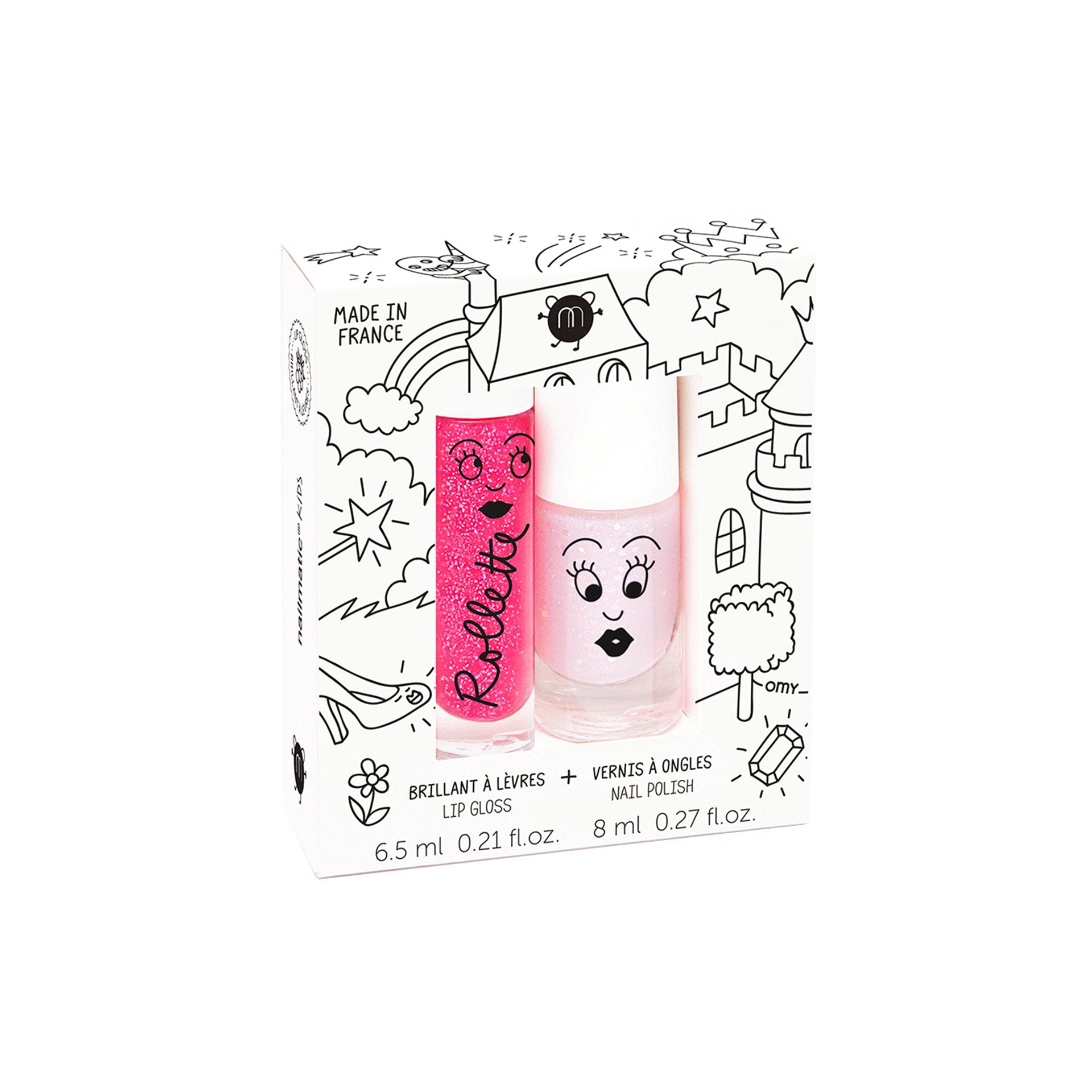 Set dúo mágico de Nailmatic que contiene esmalte de uñas y lipgloss. El esmalte de uñas al agua está especialmente diseñado para los niños y desaparece con agua tibia y jabón o directamente en la bañera. El lip gloss en formato roll-on es un producto suave para el cuidado de los labios formulado con aceite de albaricoque y vitamina E. Es transparente tras su aplicación.